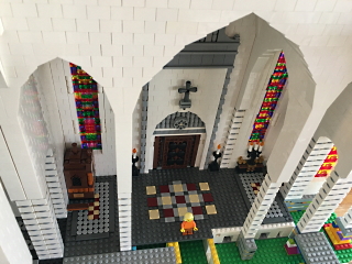 I knew from the very beginning that it would have an interior. I also wanted to include some elements that are present in real churches and cathedrals such as a pipe organ, a bunch of seats and a decent altar. The first elements of the current model that I built were the tower and the pipe organ. The tower gave me an idea of how big this model was going to be. As for the pipe organ, I thought it was too small and I knew I would have to make it bigger. More space would be needed. Once I had the tower, the organ and the altar finished, I built the first section – the front section, which is three 32 x 32 base plates wide by one 32 x 32 base plate long. I guess that was the time when I realized that this thing was going to be huge !
