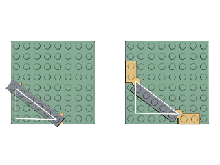 If you look at a LEGO baseplate, you will see that the studs on it are arranged in a regular grid with any two neighboring studs exactly 0.8 cm apart (measured center to center). However, this is true only if you are measuring the distance parallel to one of the sides of the baseplate. If you were to measure the distance between two studs that are next to each other diagonally, the distance would be slightly longer (√2 x 0.8 = 1.414 x 0.8 = 1.13 cm to be exact). Herein lies the problem – you can place bricks every which way on the baseplate as long as they are parallel to one of the sides of the baseplate. But as soon as you turn the bricks to an angle different from 0 or 90 degrees, the studs no longer line up.